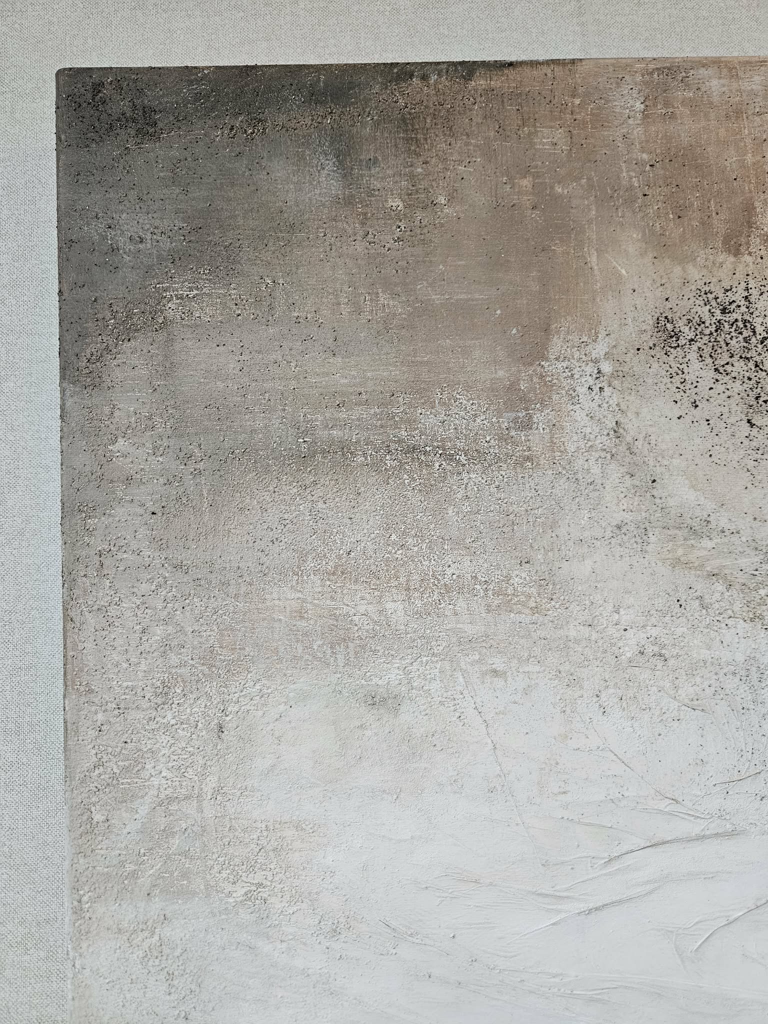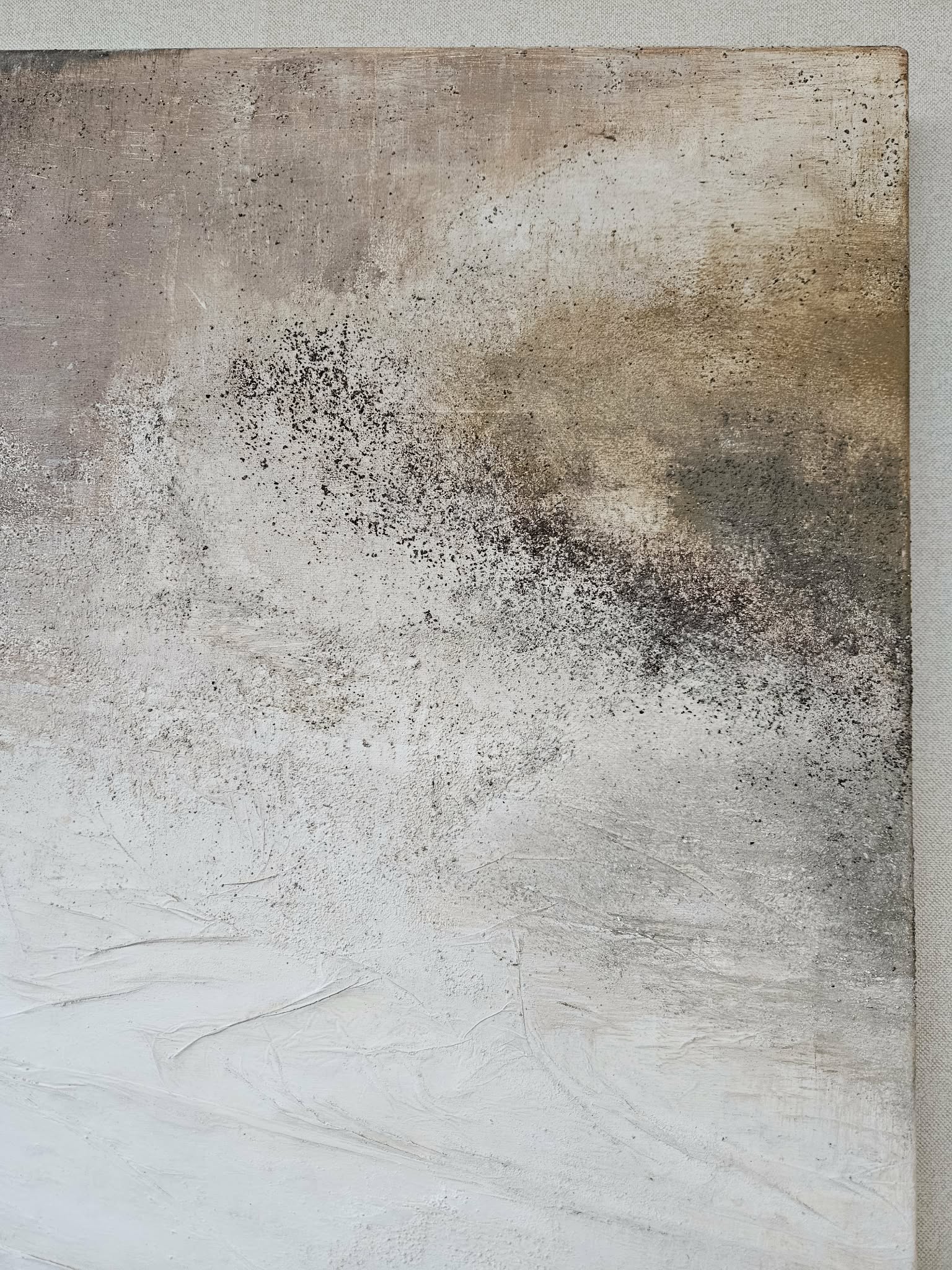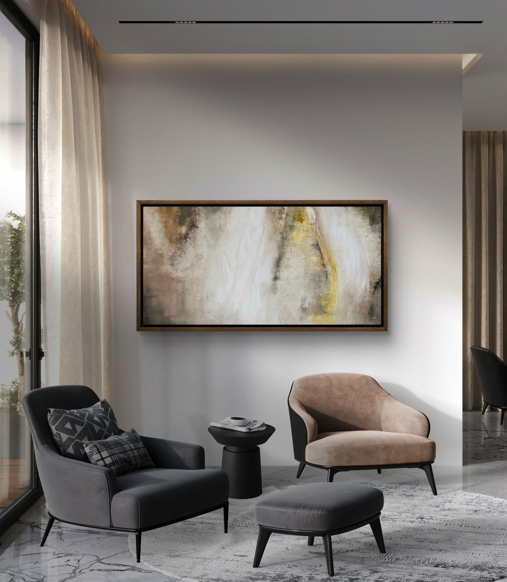 Kompozycja charakteryzuje się neutralną, stonowaną paletą barw, w tym odcieniami beżu, szarości, bieli z akcentami żółci i złota.